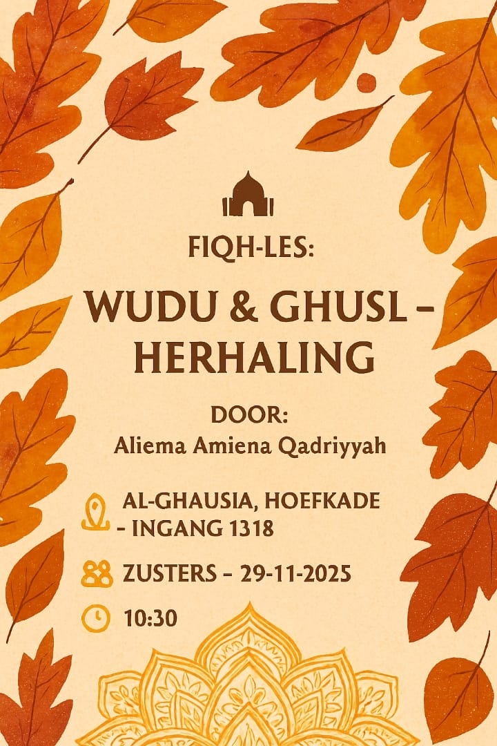 Evenement details AllesKomende20212022202320242025 Evenement details: za29nov2025 Fiqh les (alleen voor zusters)10:30Masjid Al-Ghausia