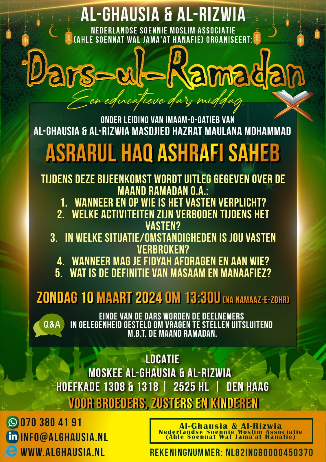Al-Ghausia & Al-Rizwia Masjid organiseert elke donderdag na het Isha gebed Halqa-e-Zikr voor mannen. Klik hier voor meer informatie.